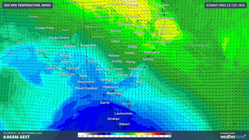 Image: 850 hPa temperature and wind at 4am on Thursday, September 26, according to ECMWF.