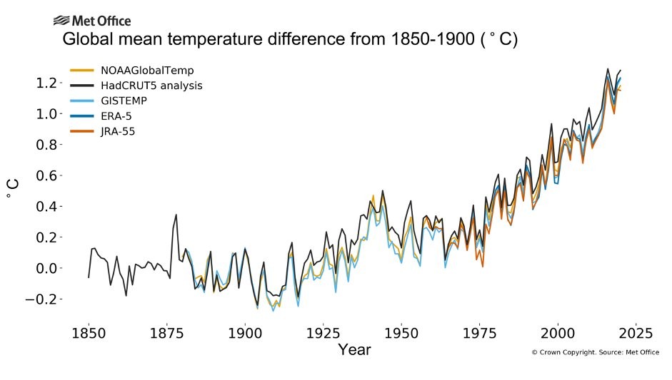 The World Meteorological Organization (WMO) has combined data from five separate datasets to come up with a single figure that represents how much our global temperature has changed relative to the pre-industrial level.