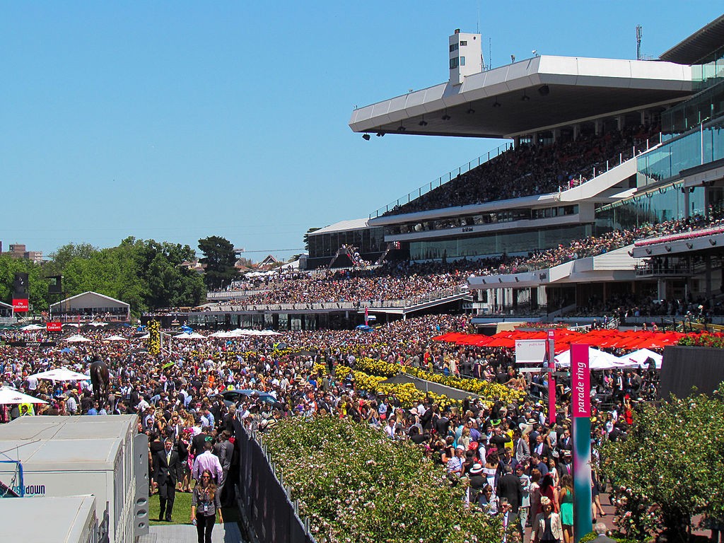 Image: Seats were full at the 2013 Melbourne Cup. This year, the sun will be shining on an empty grandstand due to Covid restrictions. Source: Jupiter Firelyte / Wikimedia Commons