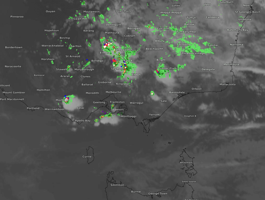 A low pressure trough over the southeast has been strengthening and, in the early hours of Friday morning, began to trigger thunderstorms. The majority of cloud-to-ground strikes that have been observed until now have occurred in central areas of the state, mainly the Northern Country district. So far, rainfall totals have been fairly modest, with the largest totals being 16mm and 14mm at Tatura and Kyabram respectively