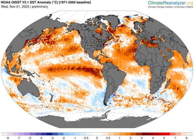 The ocean heat in 2022 reached its highest level since records began 65 years ago. The black line below shows the 2023 Sea Surface Temperatures (SSTs) have been tracking above the previous record for most of the year.