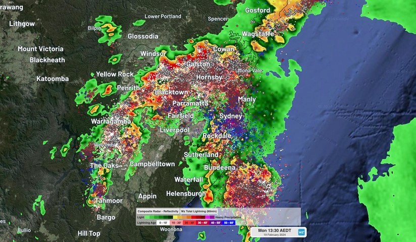 Several other storms then popped up across the Sydney Basin and by 1:30pm, the radar and lightning tracker were a kaleidoscope of colours as multiple storms assaulted the city and its surrounding suburbs.