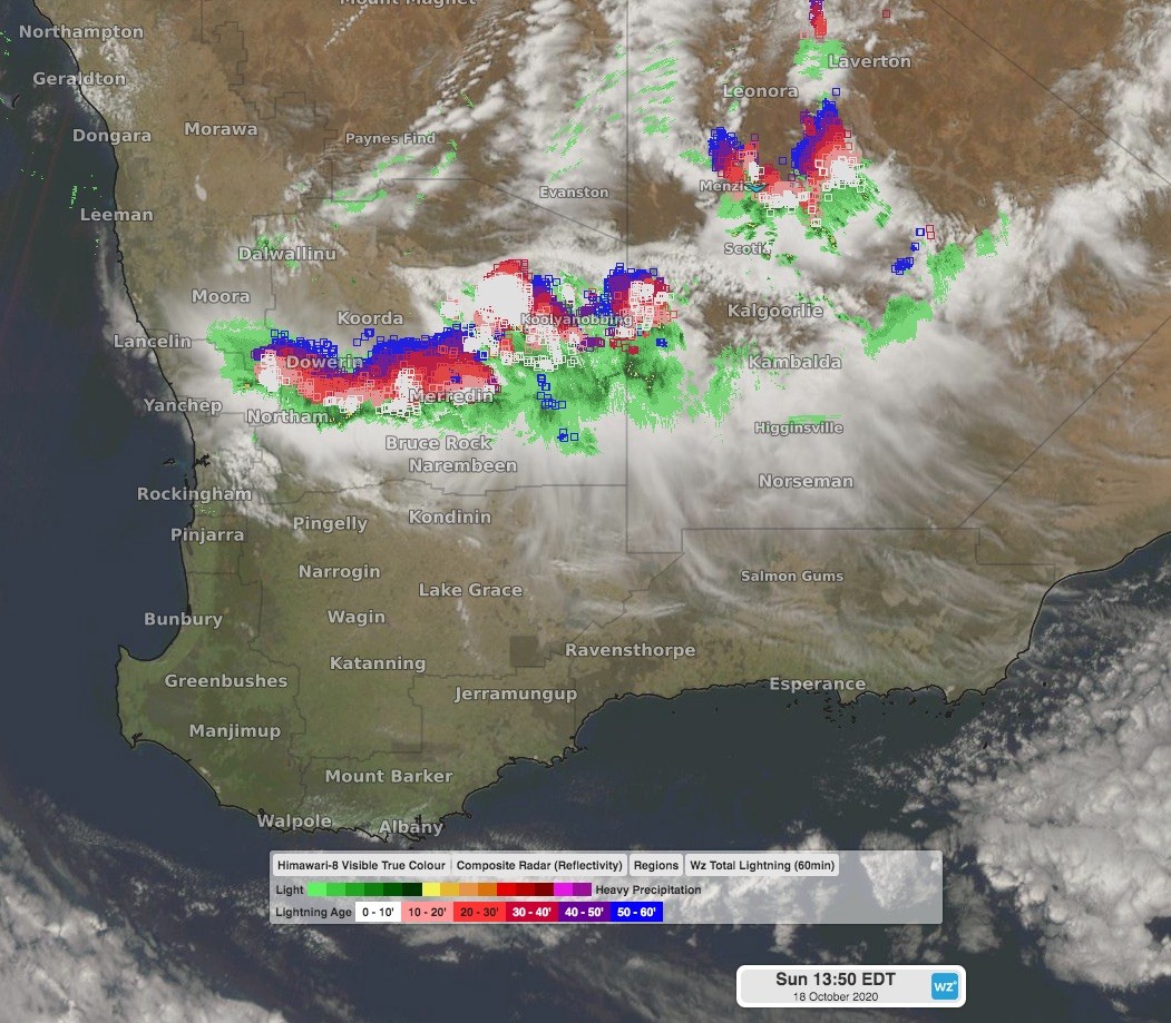 Thunderstorms have been active over areas northeast of Perth during Sunday morning, and are currently moving towards the state capital. There is a chance storms may reach Perth later Sunday evening, but are more likely to stay just to the northeast. At 11am WST on Sunday, over 54,000 lightning strikes were recorded in a 200km radius of Merredin since the early morning, over 4600 being ground strikes.