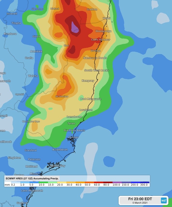 Image: accumulated rainfall to Friday, March 5th at 11pm AEDT, using the ECMWF model.