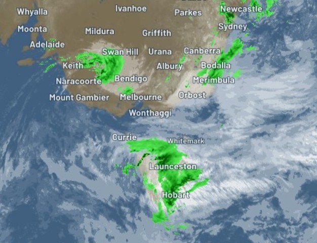 Heavy cloud is also covering Tasmania. Somewhere in that combined satellite and radar image below lies Australia’s island state.