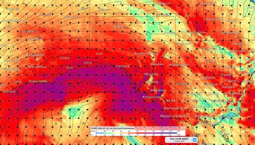 Image: Modelled wind gusts (speed and direction) at 12:30pm ACST on Thursday, August 4, 2022.