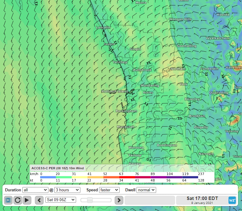 Image: cooling onshore winds developing this afternoon over Perth, as indicated by the near surface wind pattern in ACCESS-C at 2pm AWST.