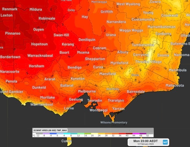 The map below shows the temperatures reaching the high 30’s to low 40’s in northwestern Vic and over much of SA.