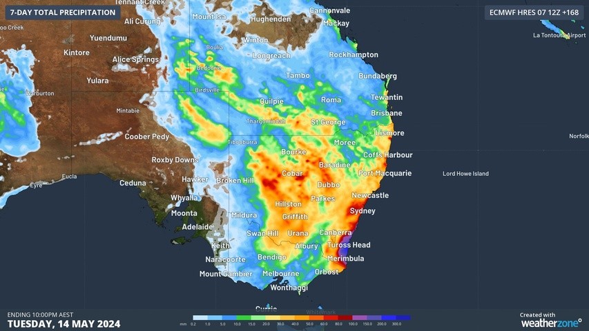 Large areas of western NSW and parts of northern Vic and southern Qld could see 20 to 40 mm of rain from this system, while some areas in western NSW should see 50 to 80 mm.