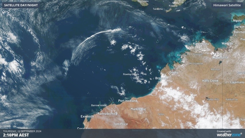 Thursday’s atmospheric gravity waves were initiated by thunderstorms and a southerly wind change over the northwest of WA on Wednesday night. By Thursday afternoon, these gravity waves had travelled more than 900 km off the state’s northwest coast and were putting on a spectacular cloud display that could be seen from space.
