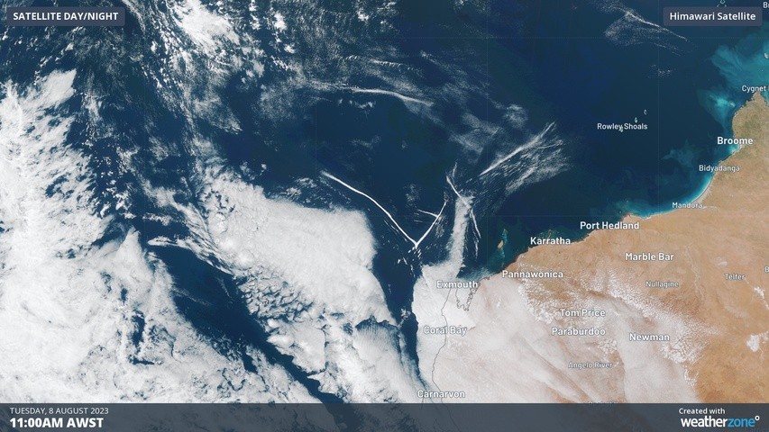 The satellite images below show thin bands of cloud moving over the Indian Ocean to the northwest of Australia on Tuesday, August 8, 2023.