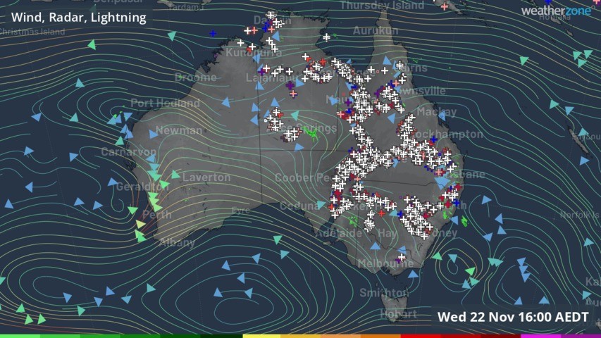 On a north-south axis, there are storms from Darwin all the way south to Port Augusta at the head of Spencer Gulf. On an east-west axis, there are storms from the Red Centre to the Sunshine Coast, while there are storms right across the interior of NSW and Qld.