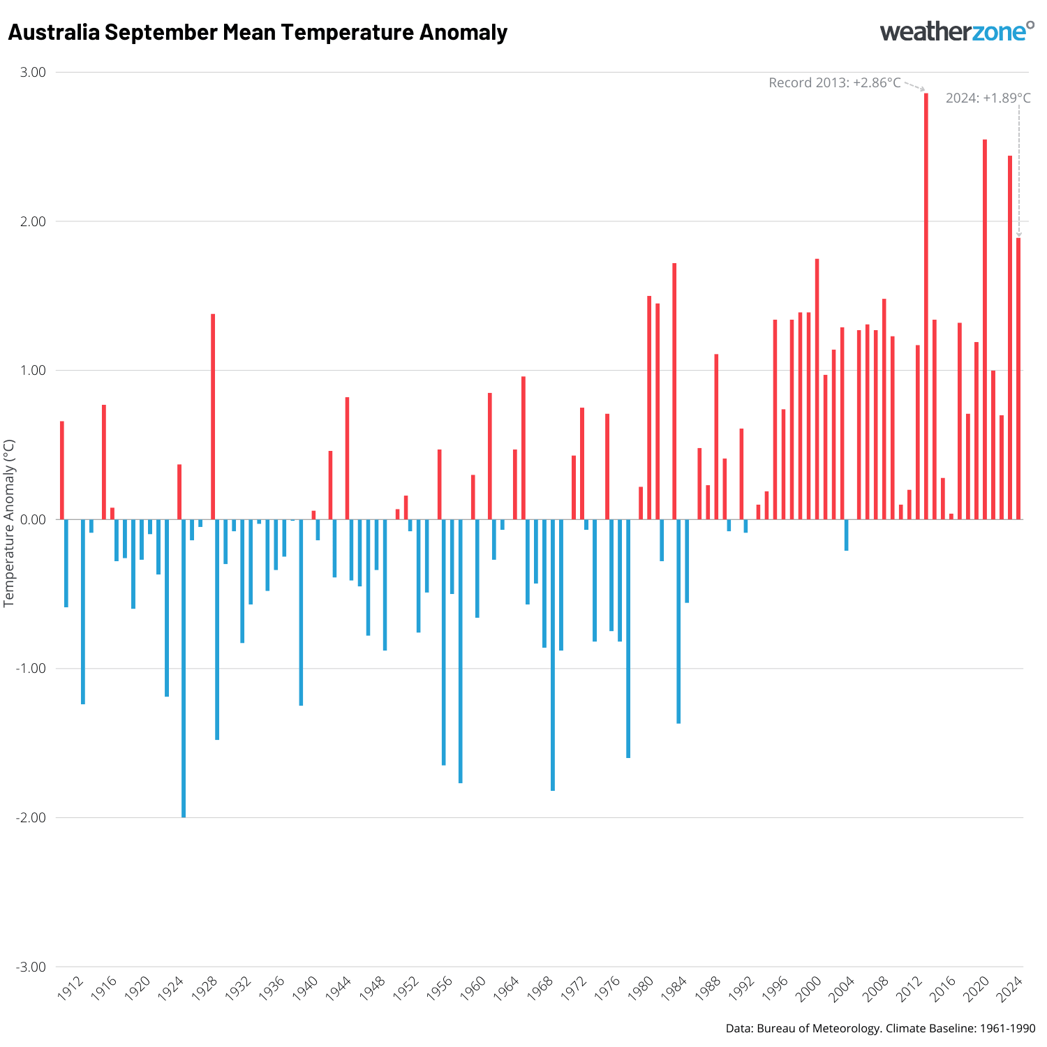 Image: September mean temperature anomaly Australia-wide (1910 to 2024). Source: BoM.