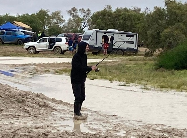 One racegoer was captured trying to hook himself something aquatic for brekky as local campgrounds were inundated by water.