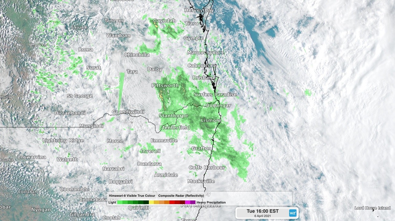 Image: Composite satellite/radar showing rain continuing in southeast Queensland and northeast NSW on Tuesday afternoon.