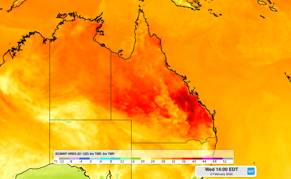 The map below shows the air temperature around 1.5 km above the surface, with a large and hot air mass extending across Queensland.