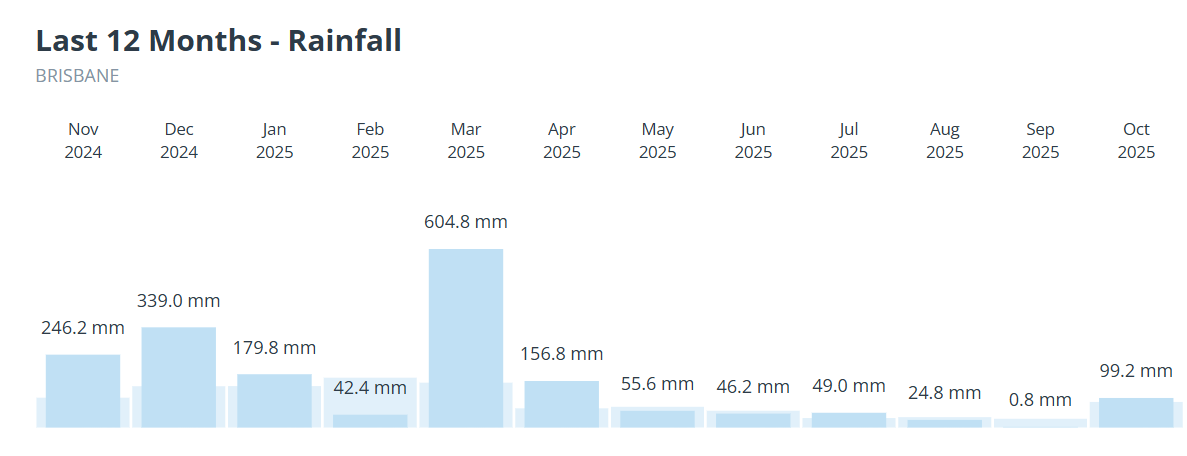 Image: Rainfall in Brisbane (sky blue) compared to the average (paler blue) in the 12 months since November 2024.
