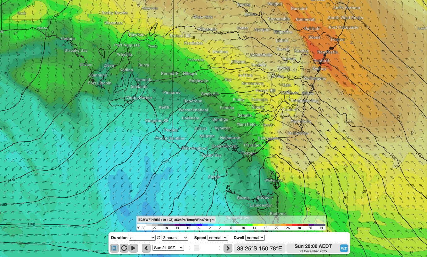 Image: Forecast temperature and wind at around 5000ft above the surface, showing the hot-cold north-south divide and strong winds near the low. Wind at this level is often a good proxy for surface wind gust strength outside alpine areas and shows greater than 50 knots (90km/h) over parts of eastern Vic and NSW. Source: Weatherzone.