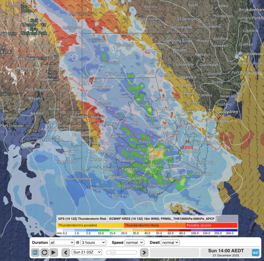 Image: Forecast storm potential according to GFS, 3-hrly rainfall and 10-minute wind according to ECMWF at 2pm Sunday afternoon, showing a swath of stormy rain extending from Vic to southern Qld and the NT. Source: Weatherzone.