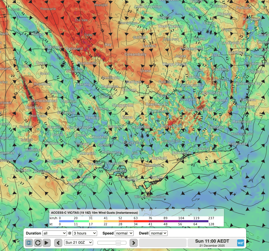 Image: Forecast 10-m wind gust animation from Sunday morning to evening, according to Access-C Victoria/Tasmania. Source: Weatherzone.