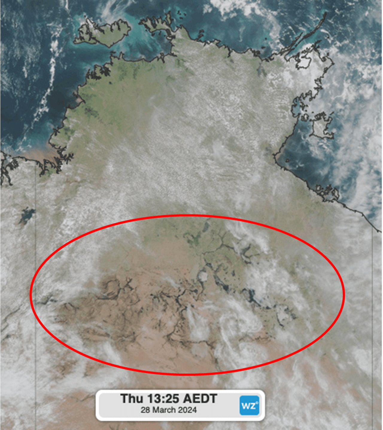Image: Himawari satellite imagery just after midday local time on Thursday March 28th showing topped up rivers across the territory. Red circles show sediment from river runoff.