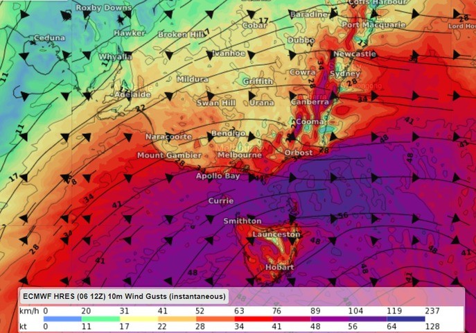 The map below shows the instantaneous wind gust forecast for Saturday evening, with strong winds impacting southeastern Australia.
