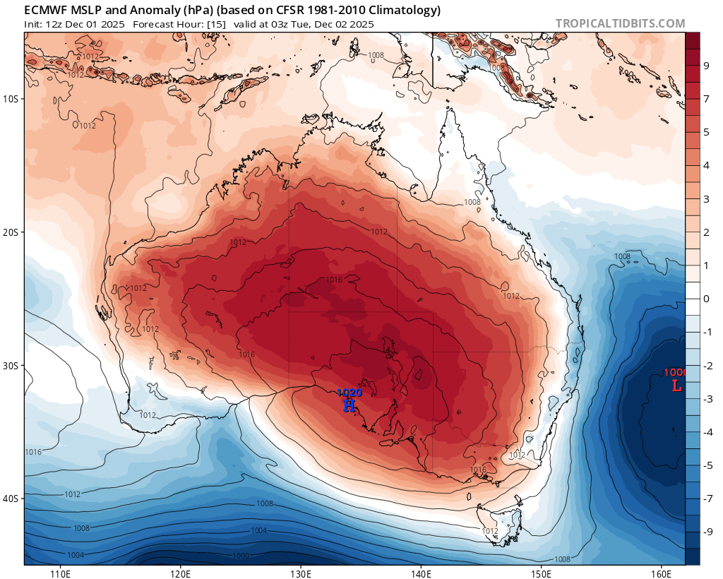 Image: Mean sea level pressure anomalies for Tuesday, December 2, 2025, showing a strong high pressure system centred over southeastern Australia, in a position more typical of winter. This contributed to the cold, still air over the ACT overnight.