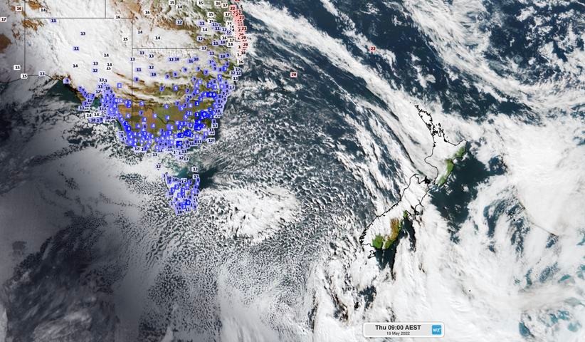 Image: Himiwari-8 satellite image and surface air temperature observations at 9am AEST on Thursday, May 19.