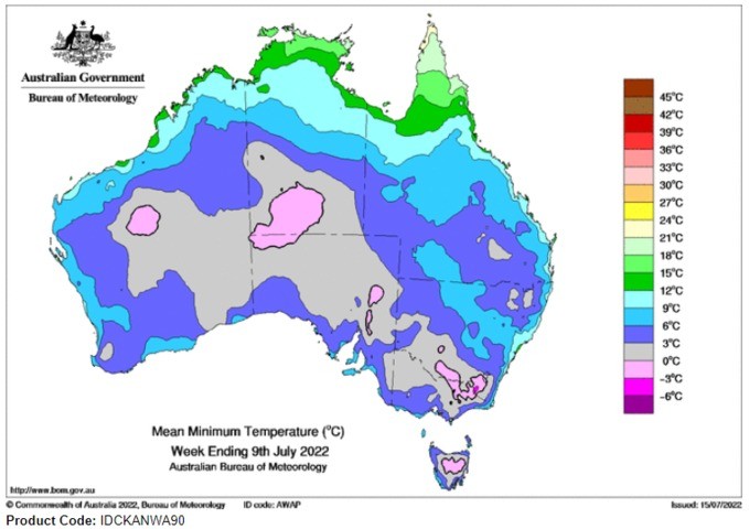 Image: Mean minimum temperature for the week 3rd-9th July 2022.