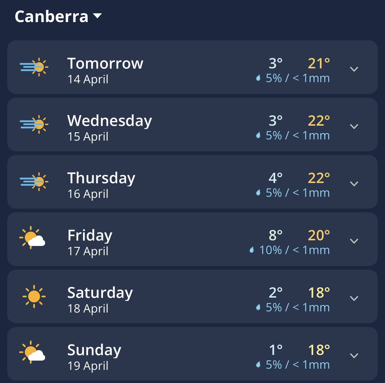Image: Daily Forecast for Canberra on the Weatherzone app.