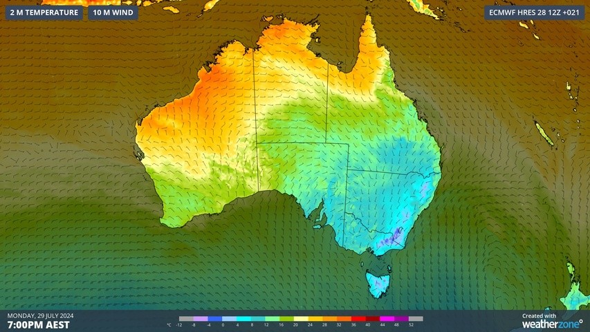 Looking ahead, maximum and minimum temperatures will remain lower than average across a broad area of southeastern Australia for the next few days and nights. Amid this lingering wintry weather, Sydney might not feel warmer than 10°C until Thursday, so rug up!