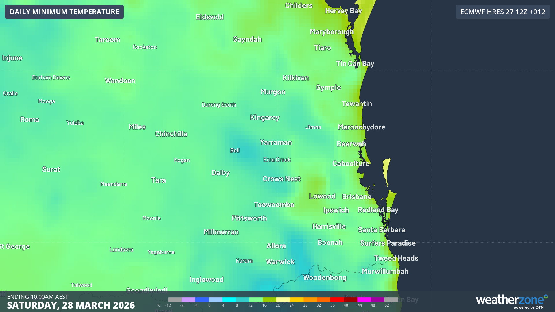 Image: minimum temperatures for Saturday, 28 March 2026. Source: Weatherzone.