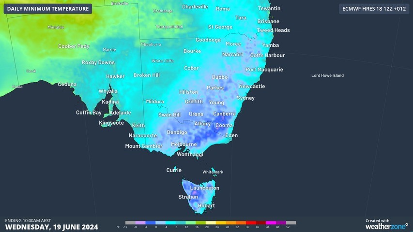 The cold start to the morning will mean that Wednesday’s daytime temperatures will struggle to reach above 16 °C in Sydney, Hobart and Melbourne.