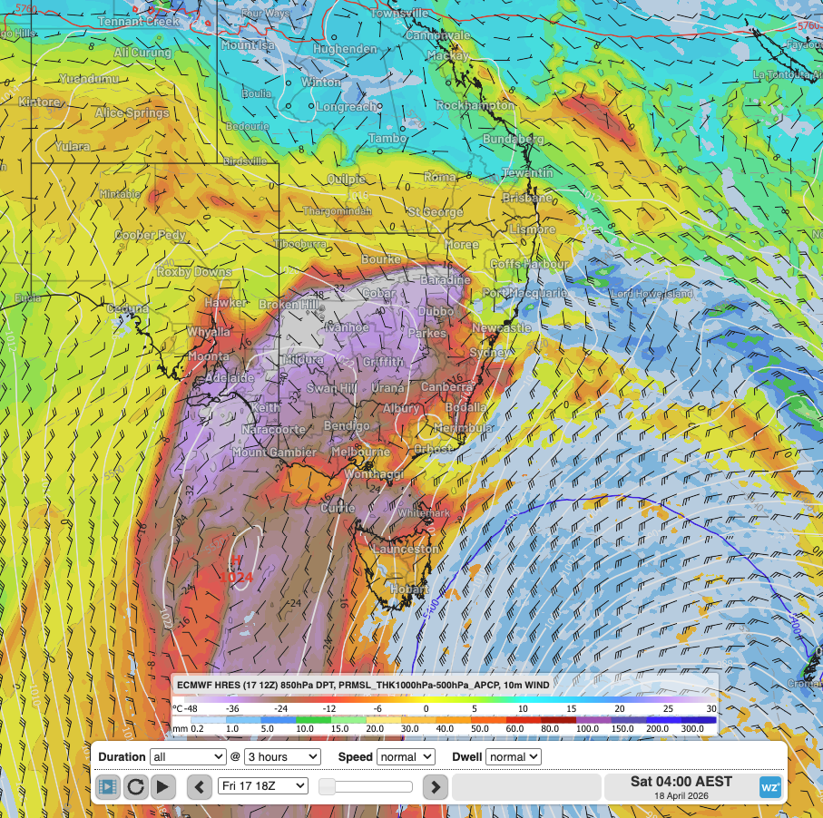 Image: Forecast dewpoints (a measure of humidity) at around 1500m about the ground, surface winds and MSLP over southeast Australia at dawn on Saturday, 18th, April, showing large very dry (purple) areas that allow that Earth’s surface to effectively lose heat overnight. Source: Weatherzone