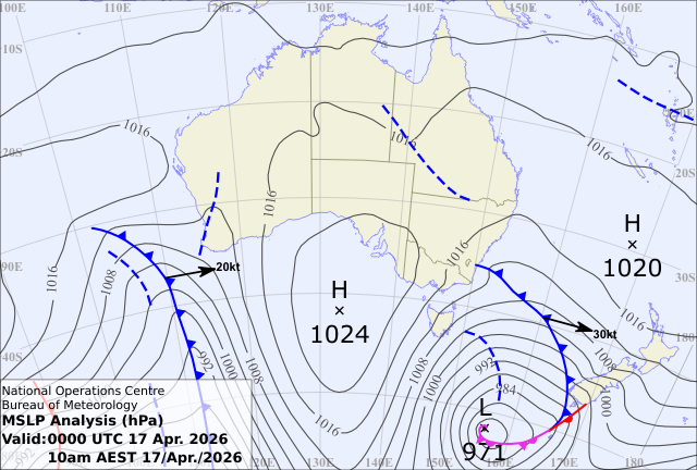 Image: Cold front skirting southeast Australia on Friday, 17th April, introducing cool SW'ly winds that quickly dropped as a high pressure system ridged in, bringing very dry air. The combination of cool, dry air and light winds is a classic set up for cold mornings. Source: Bureau of Meteorology