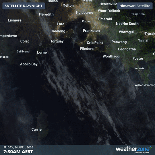 Image: Satellite images showing a contrail appearing over Bass Strait on Friday, April 24, 2026. Source: Weatherzone.