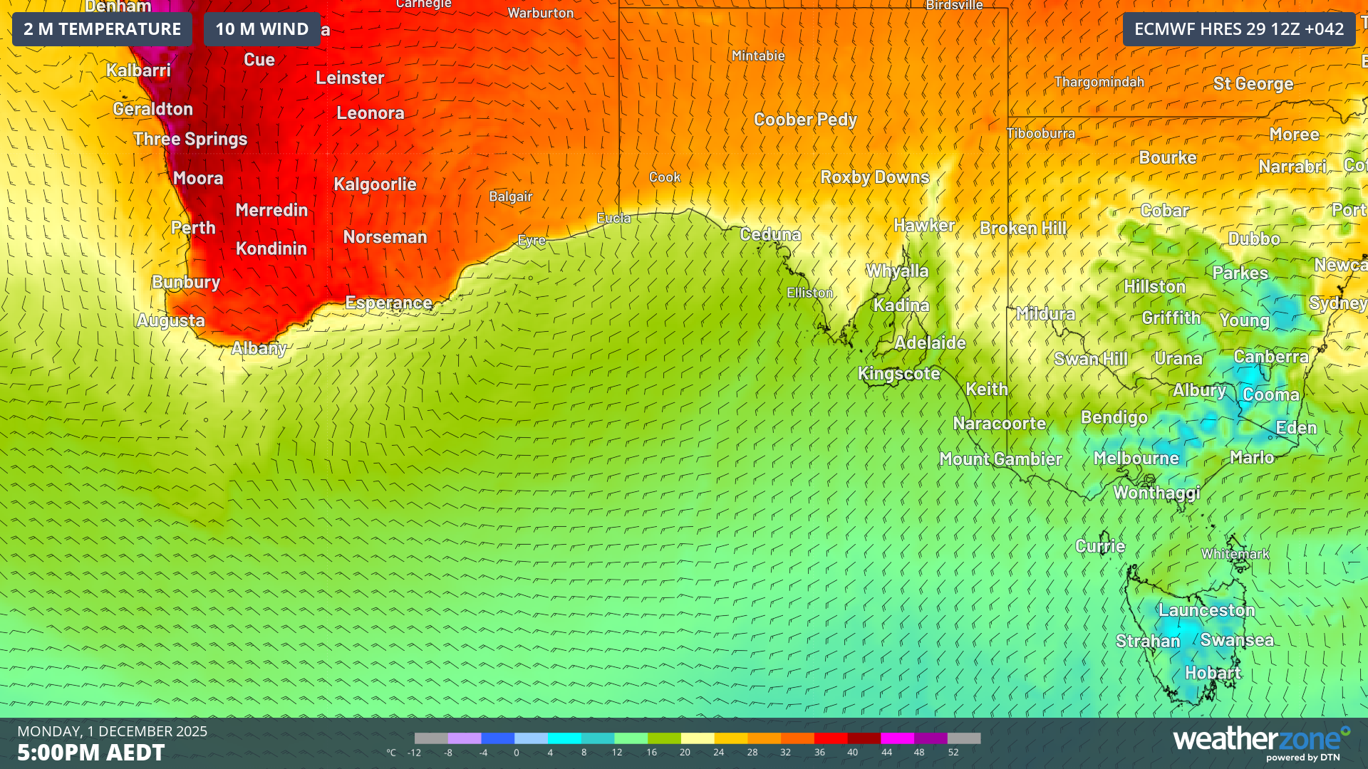 Image: Forecast temperature and winds across southern Australia on December 1st 2pm WST using ECMWF.