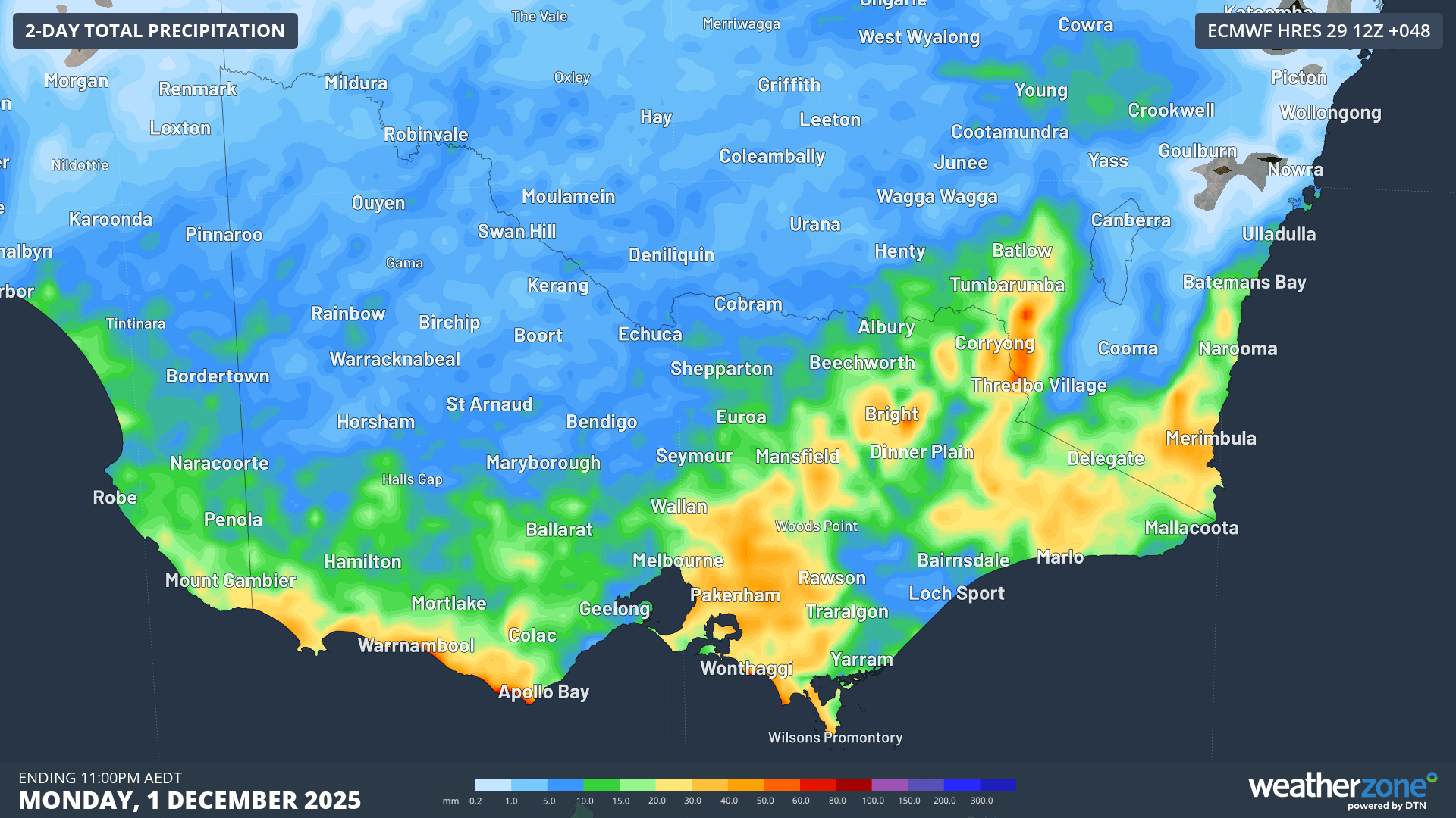 Image: Forecast accumulated rainfall for the 48 hours to December 1st using ECMWF. Victoria's rainfall should be relatively evenly split between Sunday and Monday.