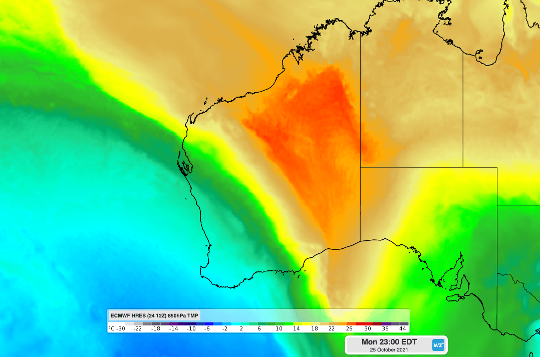 The satellite image below shows the cold front crossing the nation's southwest on Monday morning. The front is marked by the thick band of cloud over southwestern WA.