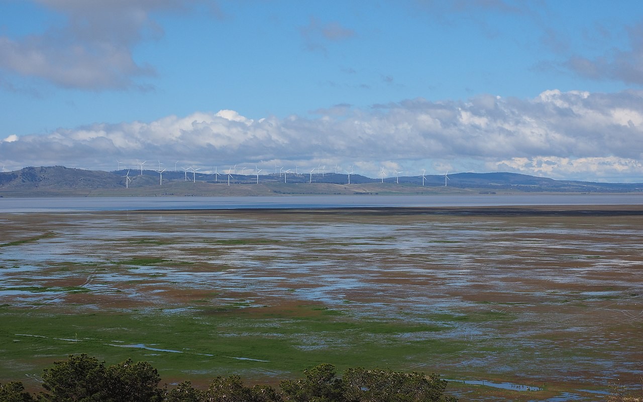 More commonly, it's a dry plain about 25 kilometres long and 10 kilometres wide, with wind turbines dotting the rolling hills to the east, and a steep escarpment on the western side.