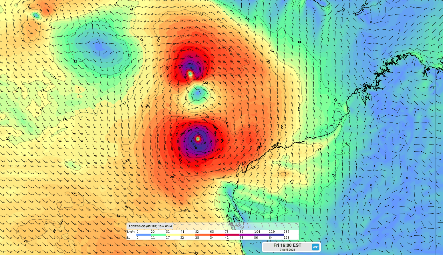 Image: Forecast surface wind speed and direction on Friday according to the ACCESS-G model, showing the interaction between Tropical Cyclone Seroja and a Tropical Low near Western Australia.