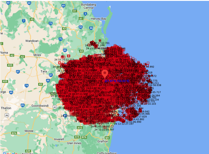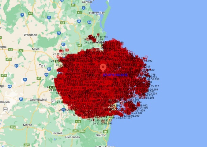 The most intense storms are unfolding in southeast Queensland, where heavy rainfall, large-to-giant hailstones, and damaging wind gusts are developing. From 9 am to 3 pm EST, a total of 211,384 strikes (comprising ground and cloud events) have been recorded within 200 km of Brisbane, including 48,281 lightning strikes hitting the ground (image).