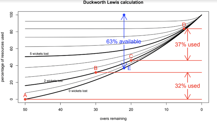 The illustration above shows how the Duckworth-Lewis calculation works in a specific case. The team batting first (in red on the diagram) bats for 20 overs, during which time two wickets are lost (from point A to point B). There is then a break for rain, after which the match is reduced to 40 overs per side, so the team resumes with the expectation that they have 20 more overs to bat (point C). They get through 15 of these overs, losing a further three wickets, but then the rain returns and puts an end to their innings at 150 for five (point D).