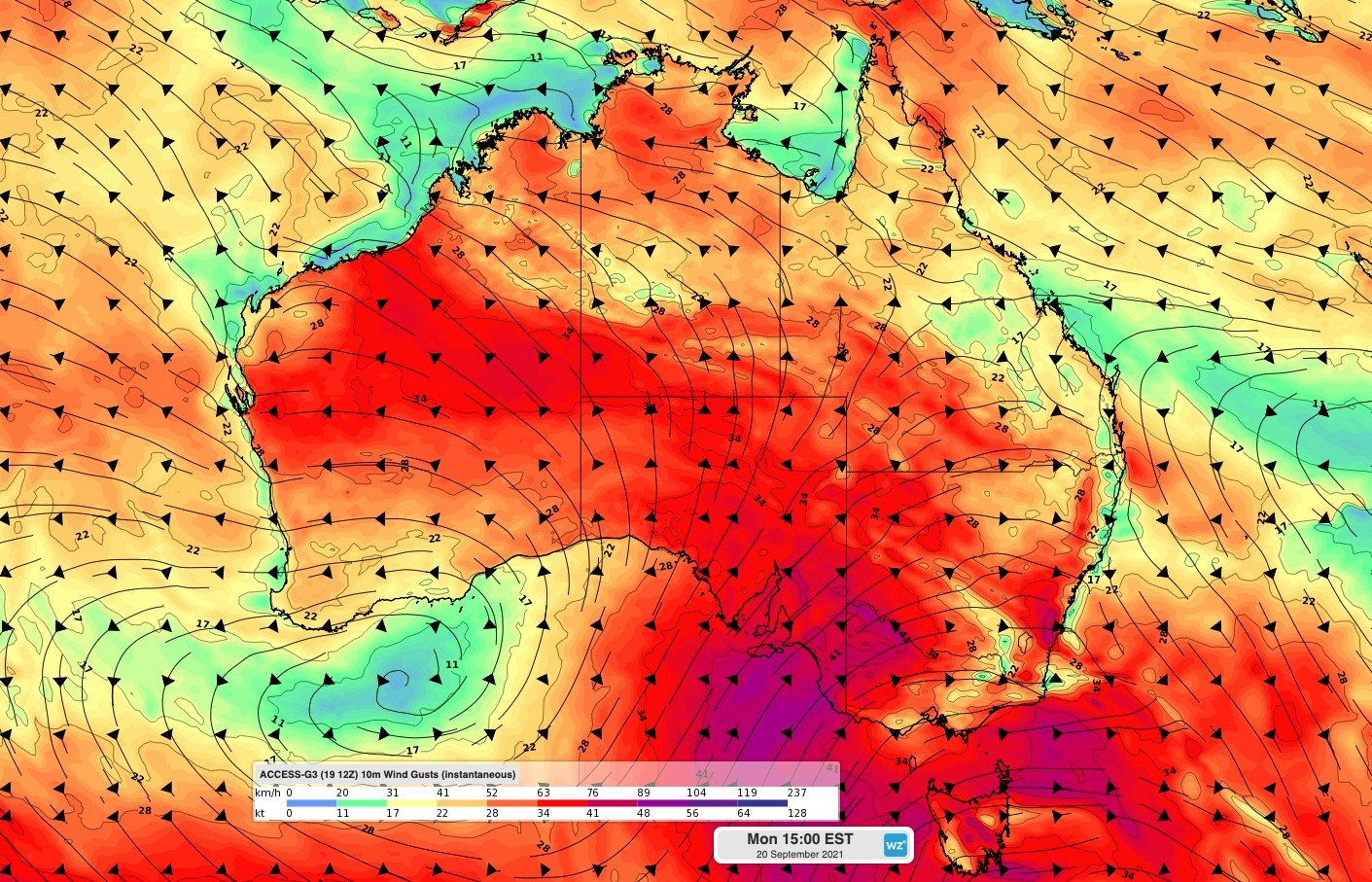 Image: Forecast wind gust speed and direction at 3pm AEST on Tuesday, according to the ACCESS-G model.