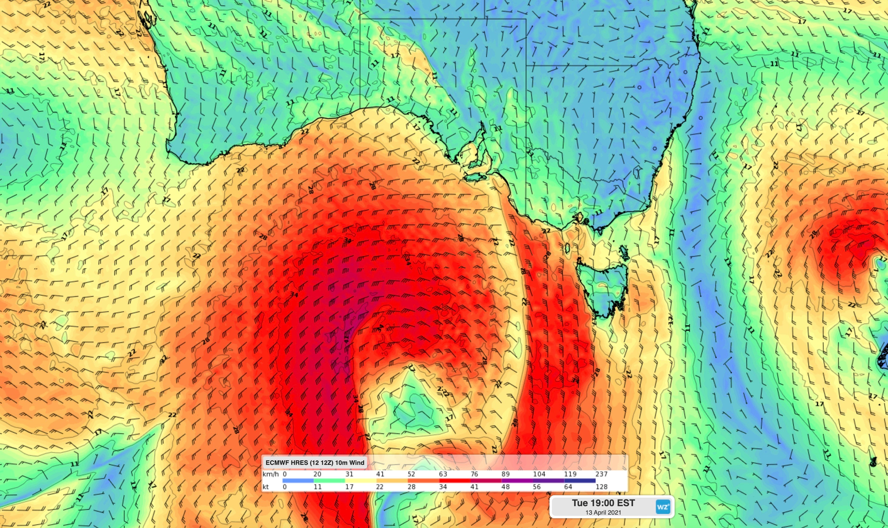 Image: Forecast wind on Tuesday evening showing the effect of the front and associated low pressure system to the south of Australia.