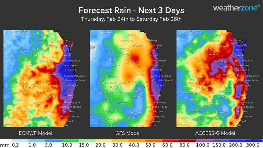 Image: Forecast 6-hour accumulated rainfall ending at 4am AEST on Friday, February 25, according to the ECMWF, GFS and ACCESS-C models.