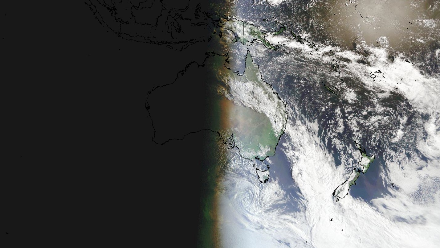 Image: Visible satellite image on Tuesday morning showing the solar terminator (line between day and night) running roughly perpendicular to the equator.