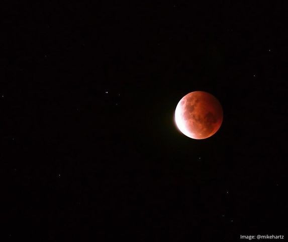 You might expect the Moon to briefly disappear as it moves through the umbra and becomes completely covered by Earth’s shadow. Instead, the Moon takes on a reddish-orange glow inside the umbra, which is why a total lunar eclipse is sometimes called a ‘Blood Moon’.