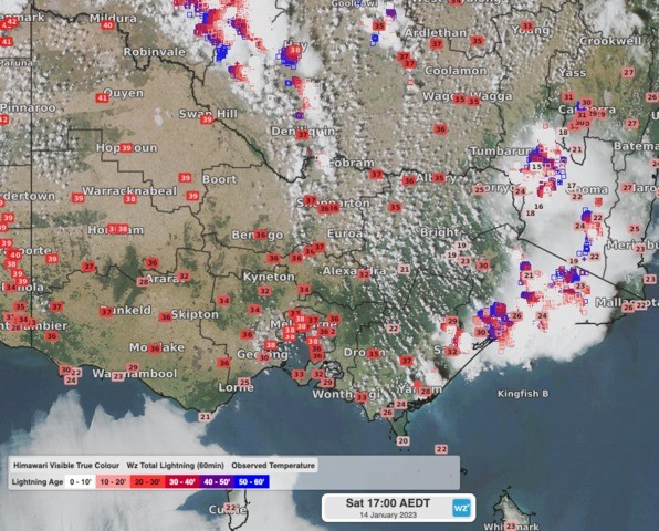 Himawari Visible True Colour imagery with observed temperatures at 5pm AEDT on Saturday