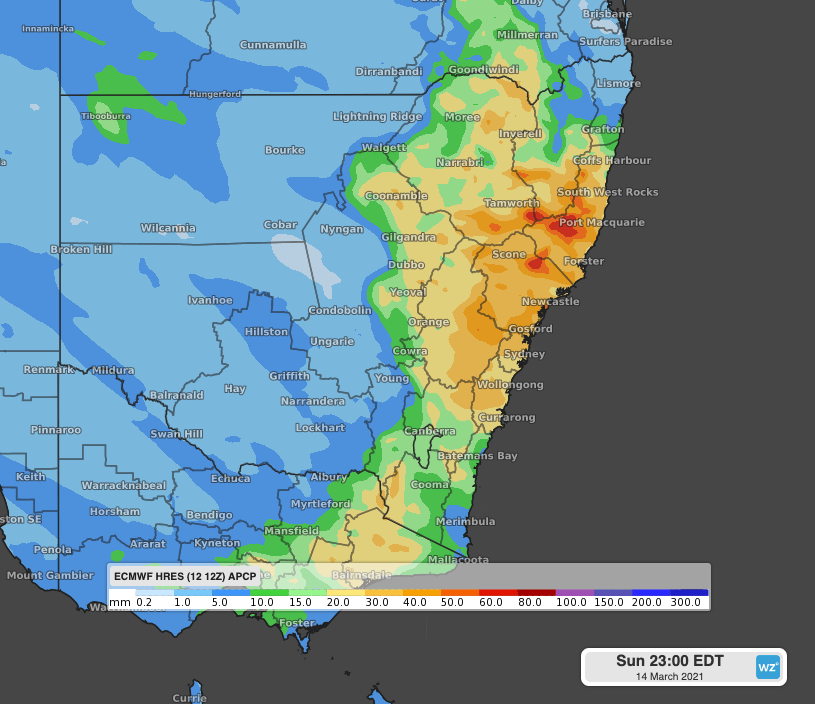 Most models suggest widespread falls of 20-50mm in 24 hours across the northeastern districts, although localised heavier falls exceeding 100mm are possible. The Sydney region could see 24-hour totals of 15-30mm, with the most significant rain over northern and western parts of the basin.